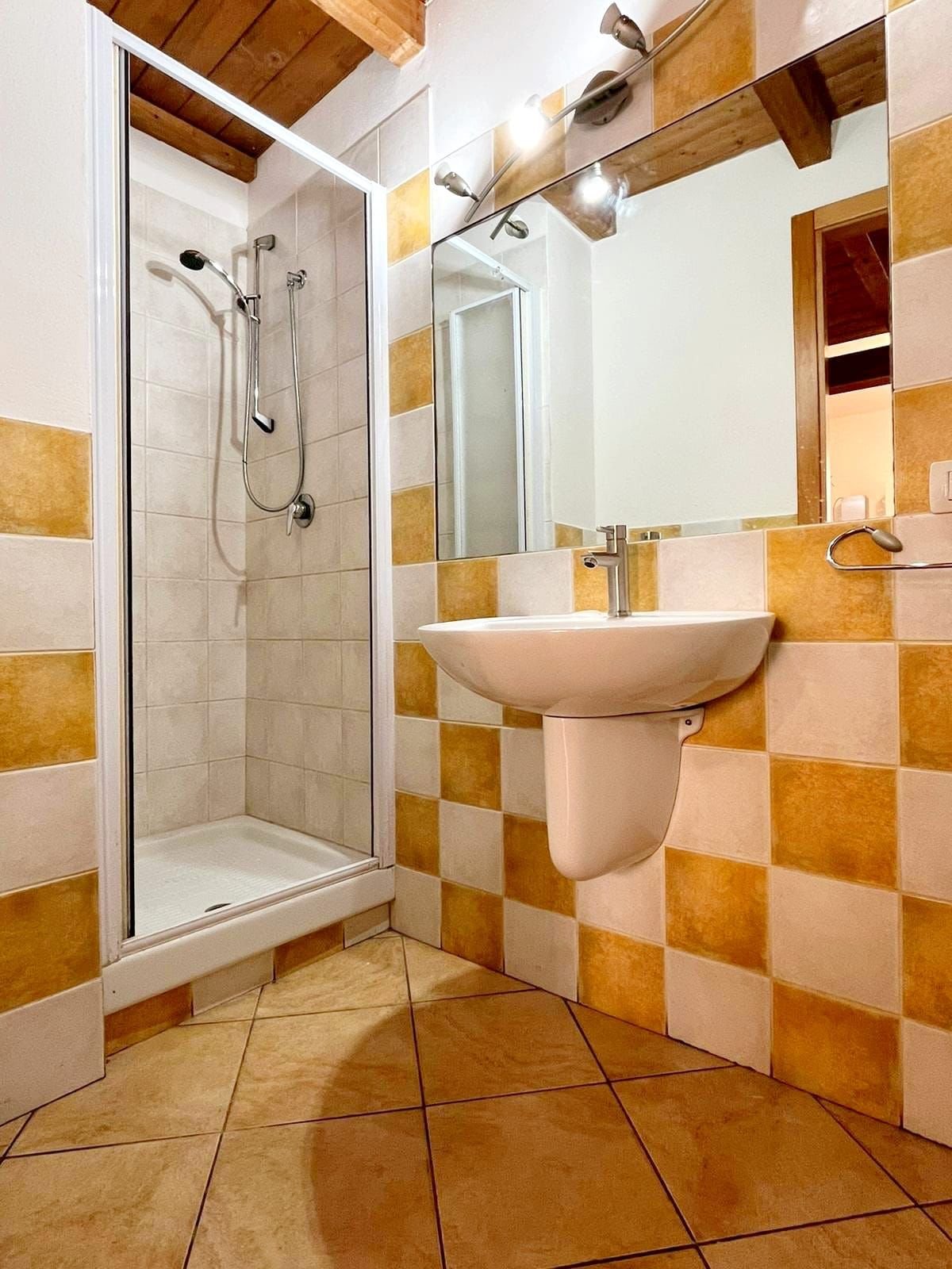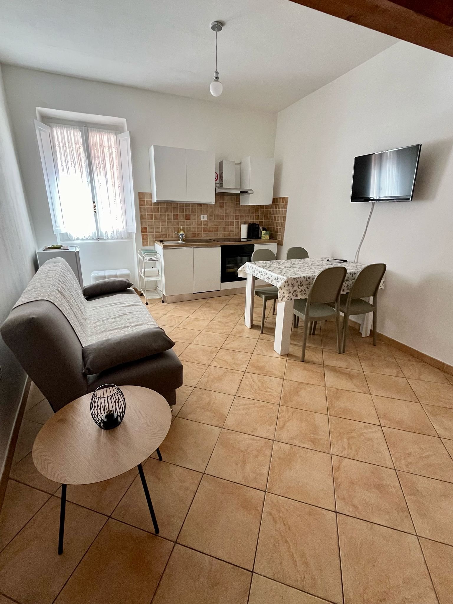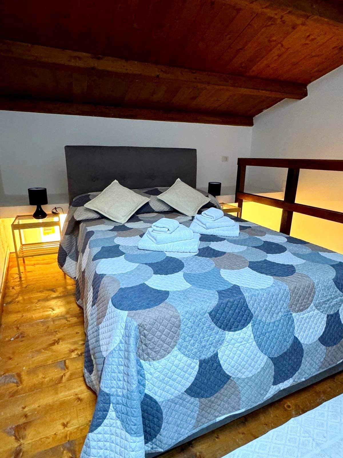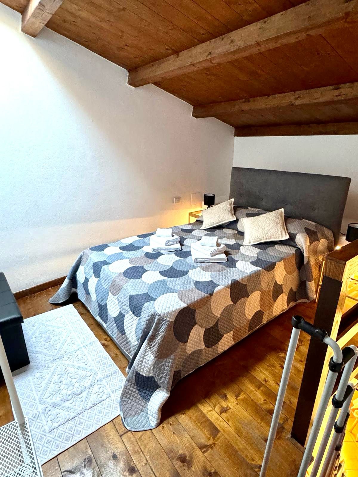 Al piano terra, troverete un luminoso soggiorno con angolo cottura attrezzato (piano a induzione, forno, frigorifero, lavastoviglie) e un bagno. Al piano soppalcato si trova la zona notte, con una camera da letto matrimoniale (letto 130×200). Nel soggiorno, al piano inferiore, è presente un divano letto (120×200), perfetto per un ospite in più o per una terza persona.